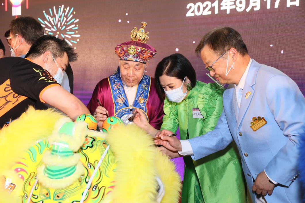 (左起) 嗇色園黃大仙祠監院兼一百周年紀慶活動籌備專責委員會主席李耀輝(義覺)道長, MH、八和會館主席汪明荃博士, DLitt, SBS、嗇色園董事會梁宇華副主席為五彩斑斕的夜光舞獅進行點睛儀式。